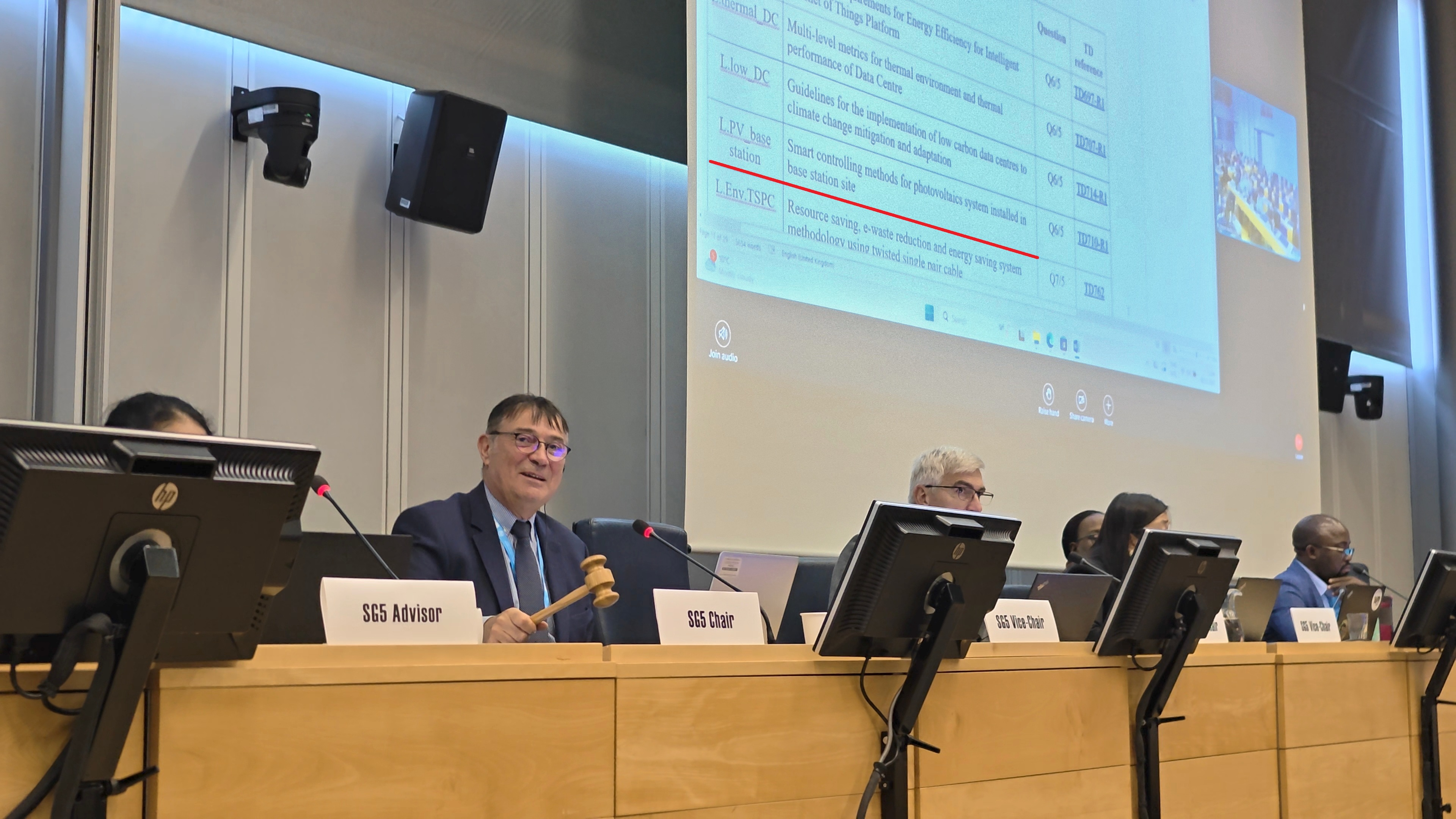 ITU-T SG5主席多梅內(nèi)克敲下木槌,宣布大會批準公司牽頭制定的ITU國際標準